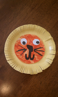 Here was the one craft we got to do, which really isn't a bad thing considering he is only two. I don't want him to feel overwhelmed starting out. I didn't have any plain paper plates, only small yellow ones, and it actually worked out well for us. Icut fring around the edge for the lion's mane and cut the center out of another one and Bray painted the back orange. After it dried I put the glue on and he placed everything else on :)